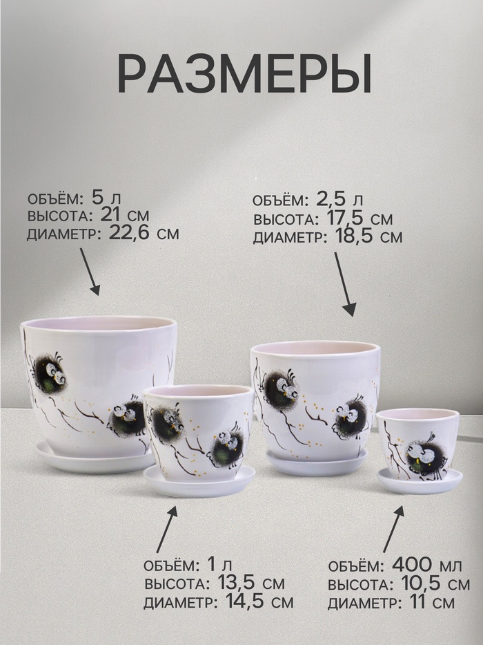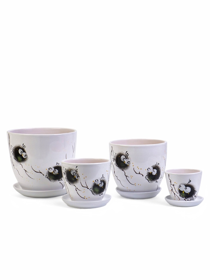 Горшок для цветов «Птички», керамика, с поддоном, набор 4 шт.: 400 мл, 1 л, 2.5 л, 5 л