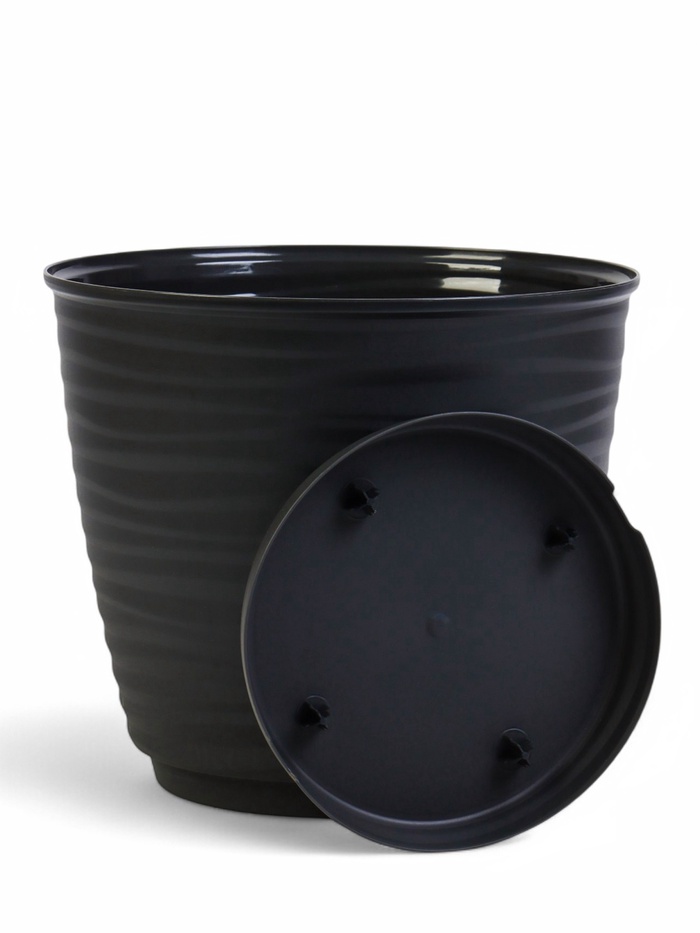 Чёрный пластиковый горшок Saffron с поддоном - стильное и практичное решение для крупных комнатных растений. Объём 9,1 л, диаметр 26,7 см и высота 24,5 см идеально подходят для фикусов, драцен, монстер и других солидных растений. Глубокий чёрный цвет придаст современный акцент вашему интерьеру, а прочный пластик гарантирует долговечность использования.