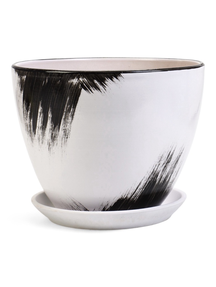 Горшок для цветов «Штрих» объёмом 8 литров — стильное и практичное решение для крупных комнатных растений. С диаметром 30 см и высотой 23 см он идеально подходит для пальм, монстер и других солидных растений. Белоснежная керамика с узором чёрного цвета придаёт особый шарм, а глубокий поддон обеспечивает удобство полива и защиту поверхностей.