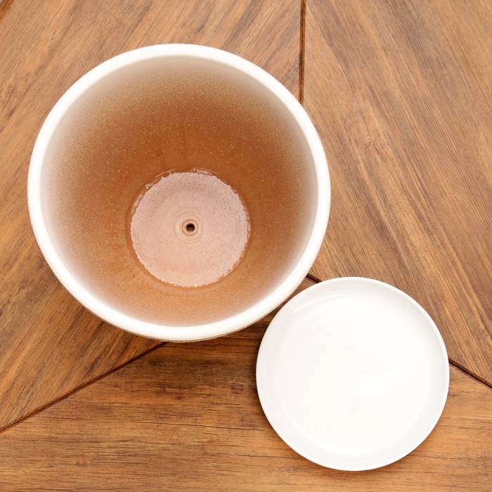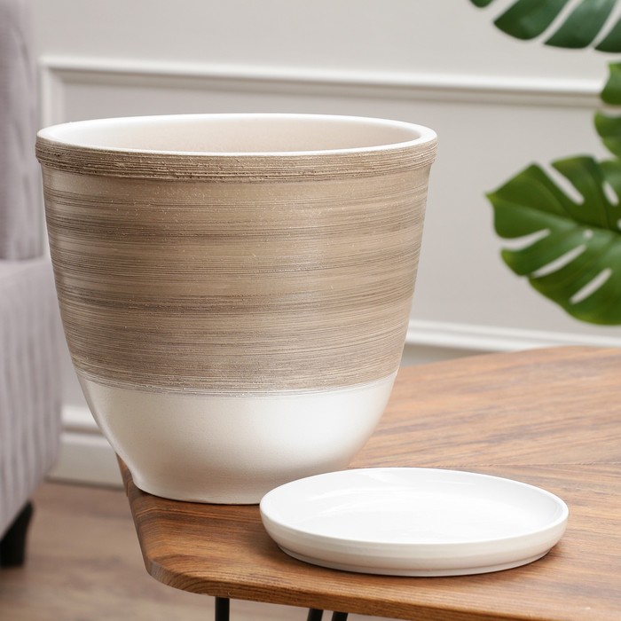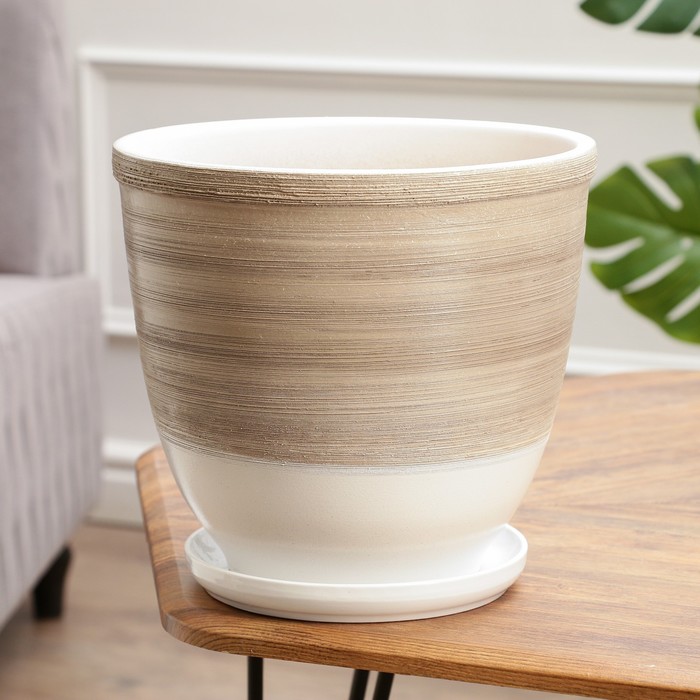 Горшок для цветов «Степь», керамический, с поддоном, 7.3 л, белый с бежевой полосой