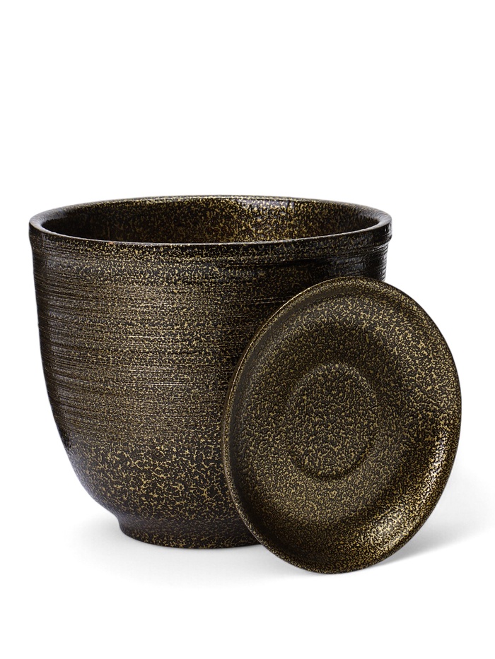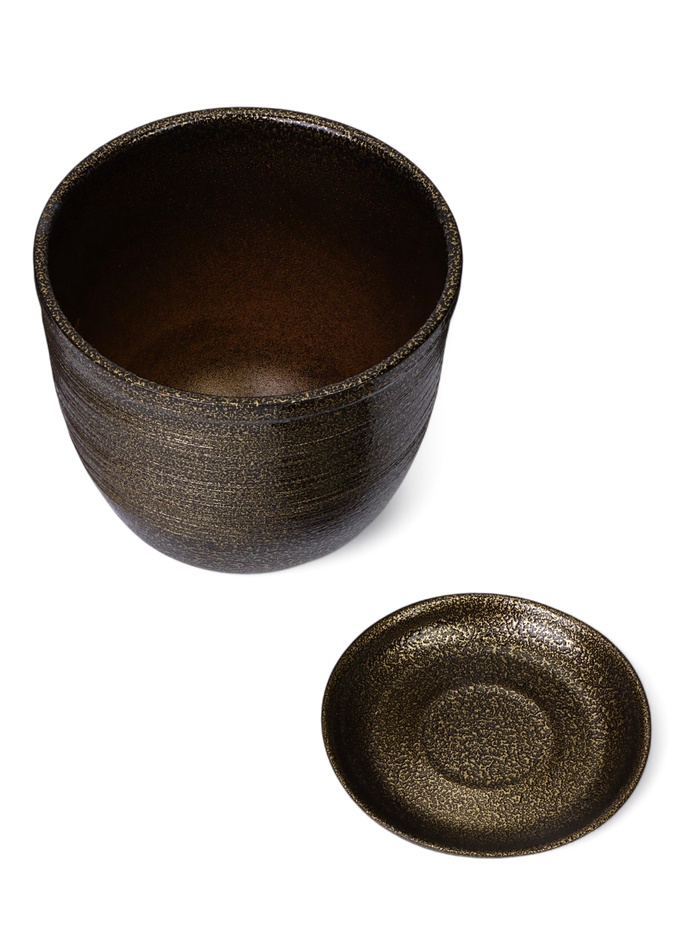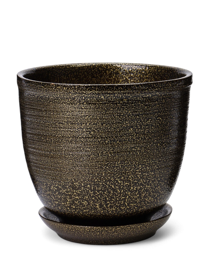 Керамический горшок «Тёмное золото» – цветочный горшок «Тёмное золото» с поддоном объёмом 1,8 литра прекрасно дополнит ваш интерьер. С его помощью можно создать уютный уголок зелени на вашем столе или полке.