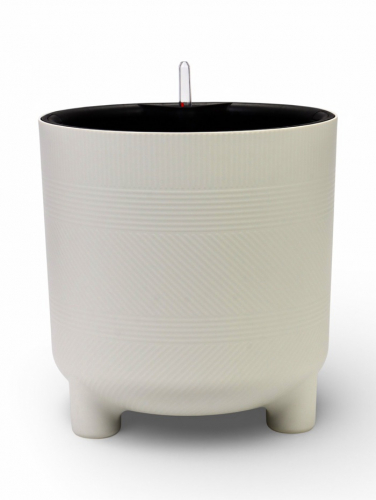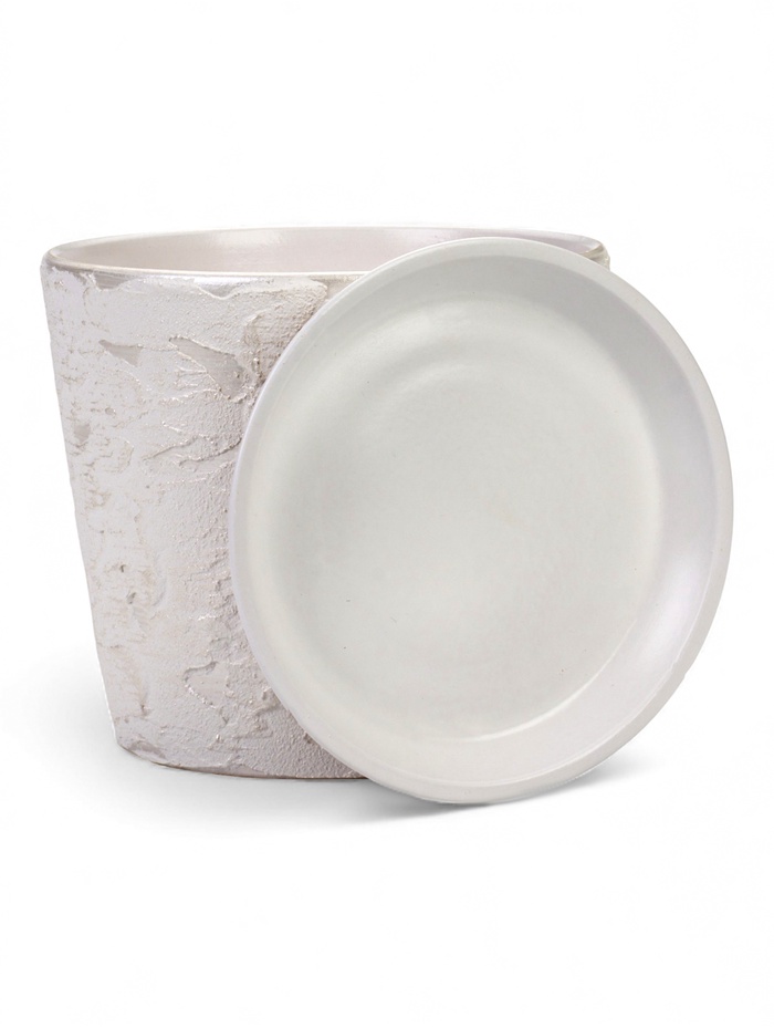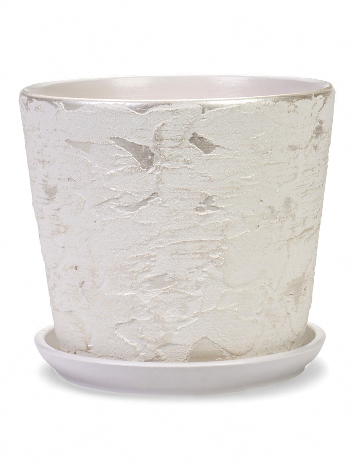 * Белый цвет с фактурой: нейтральный оттенок служит универсальным фоном, а рельефный узор создаёт игру света и тени. Такое сочетание делает горшок заметным декоративным элементом даже без растения.
