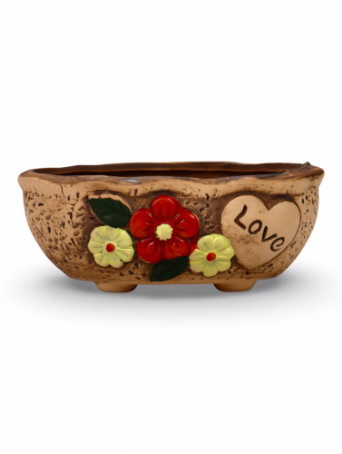 * Проработанный дизайн: горшок сочетает в себе изображение сердца, надпись «LOVE» и уникальный декор из трёх цветков. Каждый экземпляр обладает индивидуальностью.
