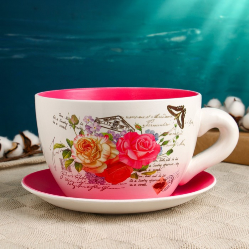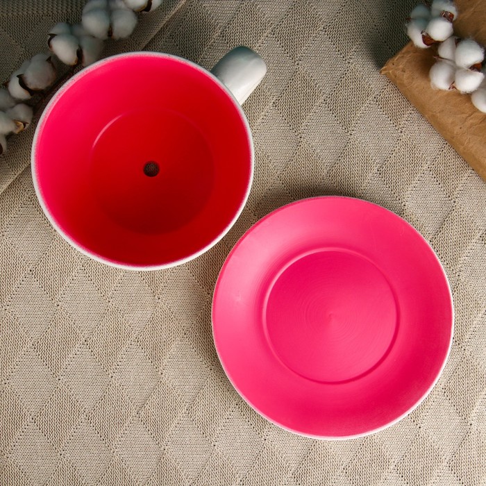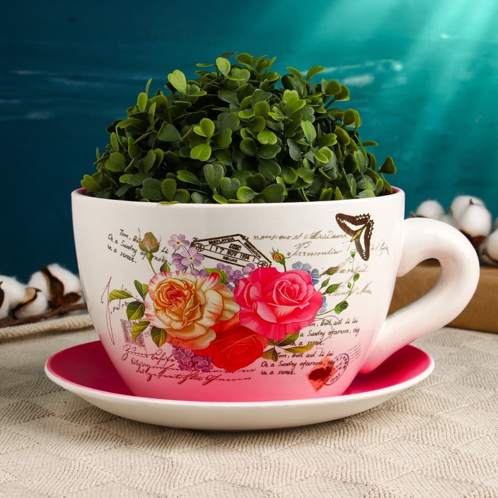 Горшок для цветов в форме чашки «Блум» керамический, с поддоном, 2.2 л, 19×24×12 см, белый, розовый, Greengo
