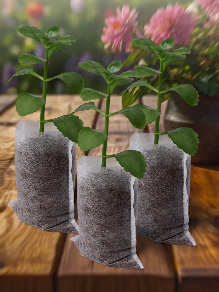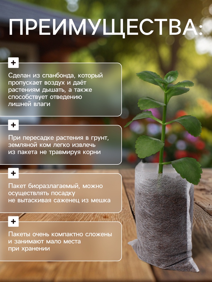 * Качественный материал: пакеты выполнены из спанбонда плотностью 25 г/м², что обеспечивает надёжность и долговечность. Эти пакеты легки, но достаточно устойчивы, чтобы поддерживать оптимальные условия для рассады.