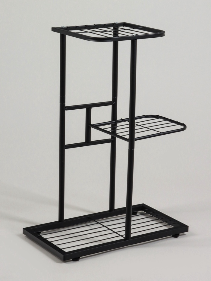 Напольная подставка для цветов с тремя полками станет стильным и функциональным дополнением интерьера. Её лаконичный дизайн и чёрный оттенок гармонично впишутся в современное пространство, подчеркнув эстетику комнаты или офиса. Устойчивая металлическая конструкция обеспечивает надёжность и долговечность, а три уровня полок позволяют эффектно разместить растения, книги или декоративные элементы.