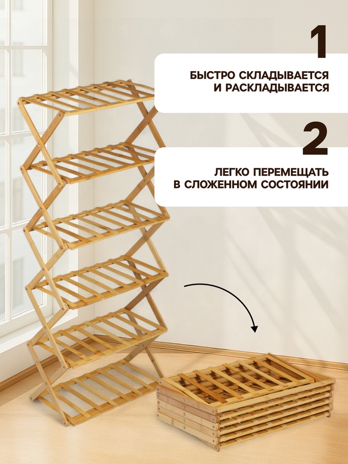 Эргономика в деталях: Бежевый цвет визуально облегчает конструкцию, делая ее органичной частью интерьера. Натуральный бамбук не требует специального ухода — для чистоты достаточно сухой или слегка влажной ткани. Этот стеллаж превращает вертикальное пространство в функциональную зону хранения без сложных решений.