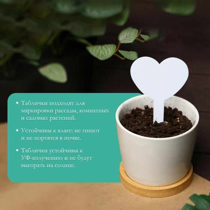 * Удобный размер — 8.5 см: таблички оптимальны для любой клумбы или цветочного горшка. Они легко втыкаются в грунт и не создают помехи для роста растений.