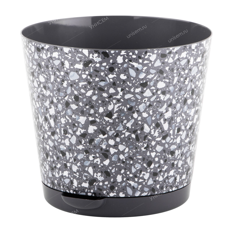 Декоративный цветочный горшок«Stone Flower»– выполнен в тёмно-сером цвете со светлыми и тёмными вкраплениями. Горшок такого размера оптимален для небольших растений. Состоит из основного корпуса и интегрированного поддона, не выступающего за дно горшка. Основной горшок имеет несколько дренажных отверстий, такая конструкция обеспечивает вентиляцию корней и предотвращает их загнивание. Поддон оснащён специальной выемкой для слива лишней воды, что очень важно при уходе за растениями. Прикорневой полив с использованием такого носика гарантирует не только удобство использования, но и обеспечивает регулирование поступление воды. Объём – 2 литра, диаметр – 16 см.