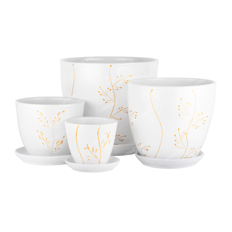 Керамические горшки являются интереснейшим решением для декорирования помещений. Набор из 4-х горшков «Акация» сделан из керамики, подойдет для разного размера комнатных растений. Окрашен в белоснежный цвет, украшен рисунком желтого цвета. Такого стиля набор впишется в любое помещение. Керамика – экологически чистый, природный материал, который имеет хорошую воздухопроницаемость. Стенки горшка сохраняют прохладу в жару и удерживают тепло на холоде. Объём – 0,4 литра, 1 литр, 2,5 литра, 5 литров.