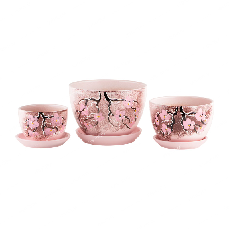 Благодаря своим уникальным природным качествам, керамические (глиняные) горшки остаются идеальным вариантом для высадки растений. Набор керамических горшков «Сакура» состоит из 3-х горшков розового цвета с рисунком сакуры. После обжига готовый горшок сохраняет пористую фактуру глины. Именно эта пористость позволяет воздуху проникать внутрь горшка, исключив застаивание влаги в земле и загнивание корней. Так же глиняной горшок может предотвращать и чрезмерное высыхание почвы, ведь за счет своих изоляционных свойств, горшок слабо нагревается на солнце.