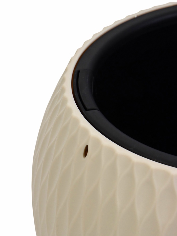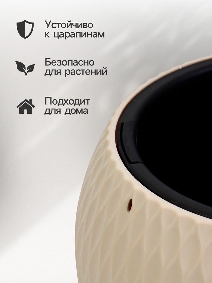Теплое бежевое кашпо объемом 4 литра из качественного пластика. Изящная округлая форма с практичной вставкой создает гармоничный образ. Идеально подходит для размещения на столах, подоконниках и других горизонтальных поверхностях.