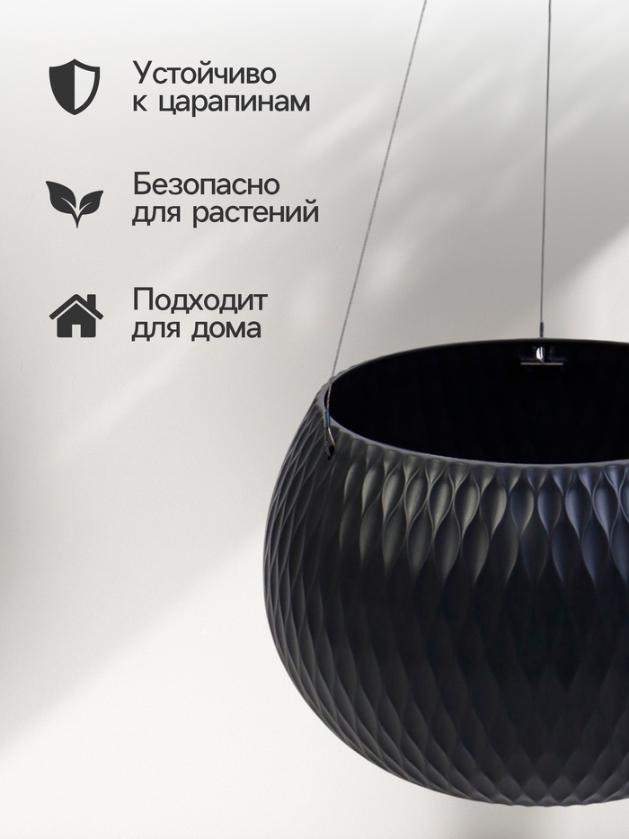 Кашпо для цветов «Жемчужина», 4 л, d=29 см, h=19.5 см, пластик, со вставкой, подвесное, цвет графитовый