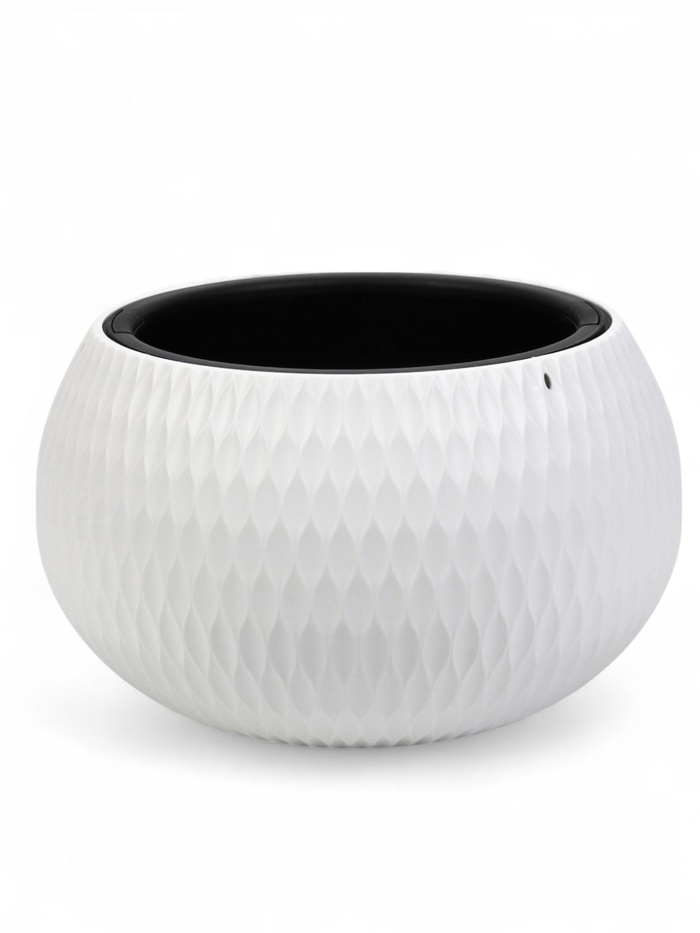 Белоснежное кашпо объемом 7 литров (диаметр 36 см, высота 22 см) из прочного пластика. Изысканная округлая форма с удобной вставкой создает идеальные условия для роста растений. Идеально подходит для размещения на столах, подоконниках и других поверхностях.