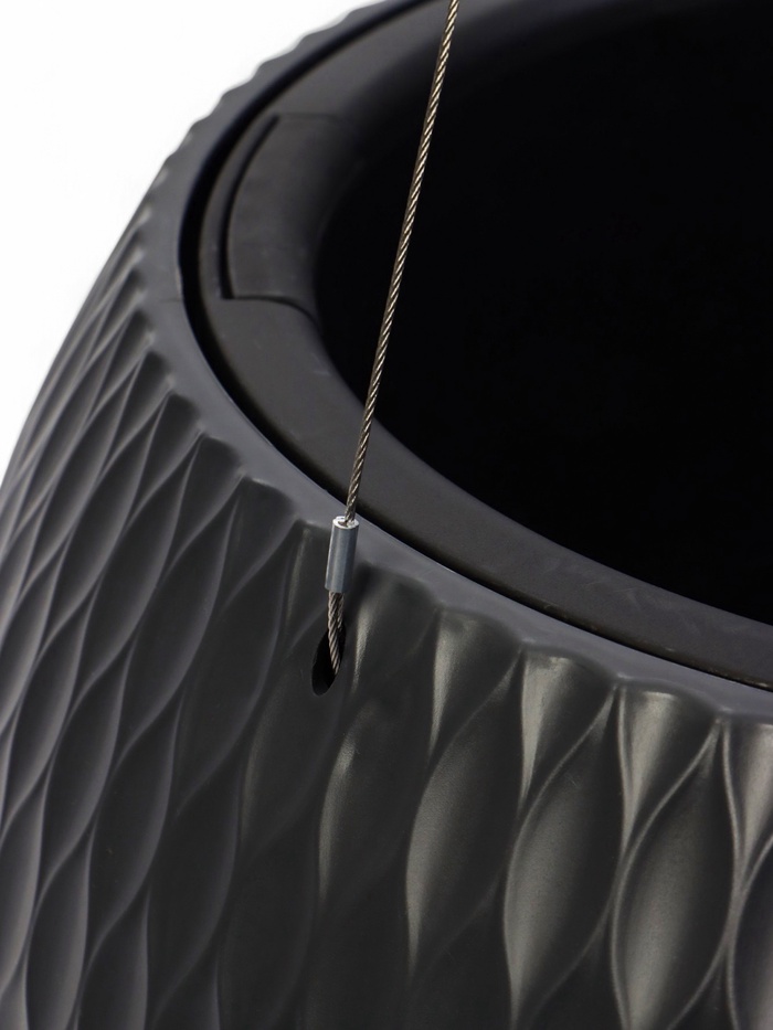 Подвесное кашпо объемом 7 литров (36×22 см) из прочного пластика с удобной вставкой. Стильная округлая форма и благородный графитовый цвет органично дополнят любой интерьер. Подходит для подвесного и настольного размещения.