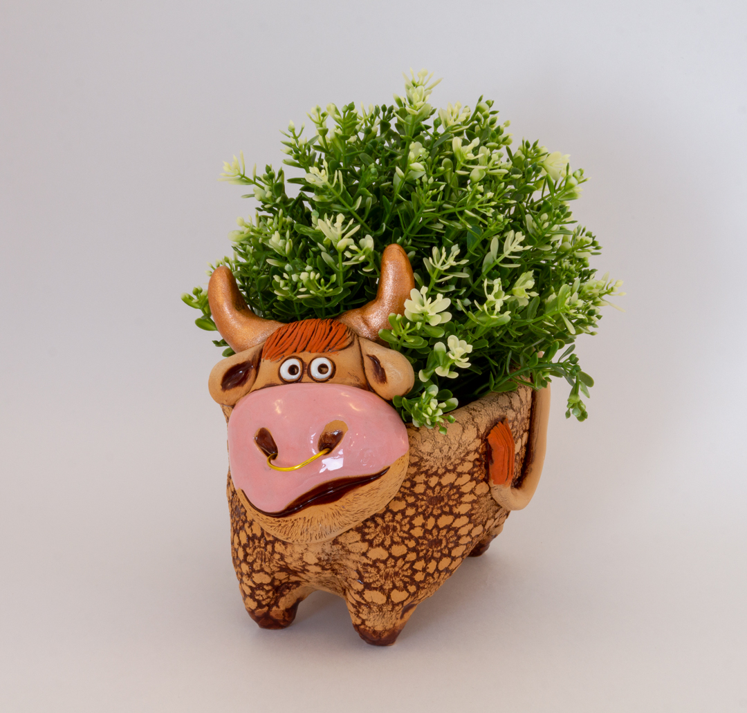 Керамическое кашпо – оригинальное и практичное решение в создании неповторимого интерьера, уюта и атмосферы дома или офиса, они помогут Вам подчеркнуть натуральность, уникальность и своеобразие. Изделие выполнено в достаточно оригинальной форме – в форме быка. Кашпо без поддона и не имеет дренажного отверстия. Не рекомендуется пересаживать растение в кашпо без дренажного отверстия – лучше вставить в него пластиковый горшочек, чтобы было удобно поливать (это защитит от перелива растений и загнивания корней). Объём – 1 литр. Размеры – 10*17*13 см.