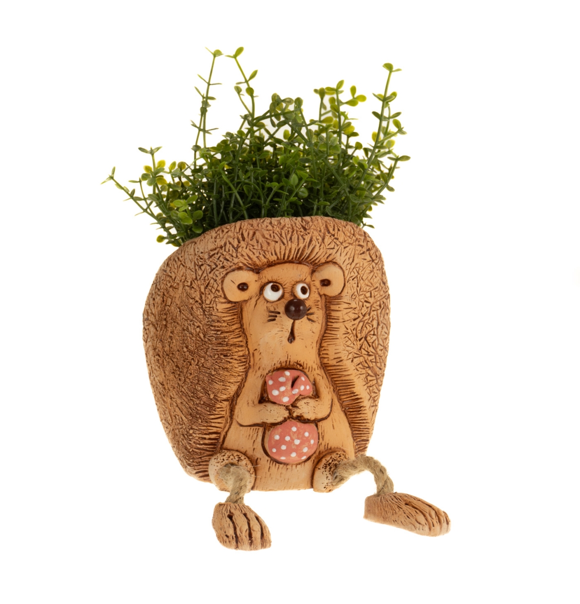 Кашпо для небольших растенийвыполнено в форме симпатичногоёжика с узелком. Изящно выполненный вручную дизайн, качественный материал и оригинальная форма позволят выделиться среди обычных горшков для растений. Каждая деталь проработана с любовью и вниманием к мельчайшим нюансам, что делает этот предмет декора по-настоящему уникальным. Хорошо подойдёт в качестве подарка для человека, который любит лес и животных в целом. Изделие сделано из качественной и прочной керамики, устойчивой к воздействию влаги и перепадам температур. Это гарантирует долговечность изделия и возможность использования как в помещении, так и на улице. Такое кашпо можно использовать не только под растения, но и в качестве вазы для сухоцветов, подставки для мелочей или органайзера.Преимущества:• оригинальная форма кашпо;• прочная, экологичная керамика;• подходит для небольших растений.Характеристики:• объём – 0,3 л;• цвет – коричневый.