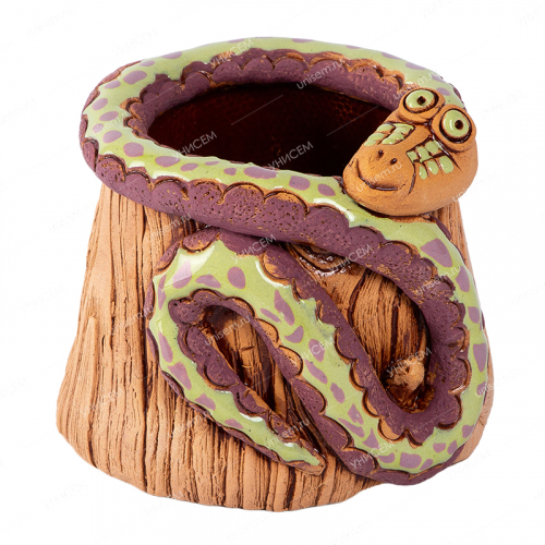 Керамическое кашпо –оригинальное и практичное решение в создании неповторимого интерьера, уюта и атмосферы дома или офиса, оно поможет Вам подчеркнуть натуральность, уникальность и своеобразие. Данное кашпо выполнено в достаточно оригинальной форме – в форме пенька со змеёй. Идеально подойдёт для выращивания кактусов, суккулентов и других небольших растений. У такого кашпо нет дренажного отверстия, поэтому растение лучше сначала посадить в пластиковый горшочек, а потом только поставить в кашпо (это защитит от перелива растений и загнивания корней).Преимущества:• прочная, экологичная керамика;• идеально для подарка на любой праздник;• пористая структура позволяет растениям дышать.Характеристики:• цвет – коричневый, зелёный;• размеры – 9*7*9 см.