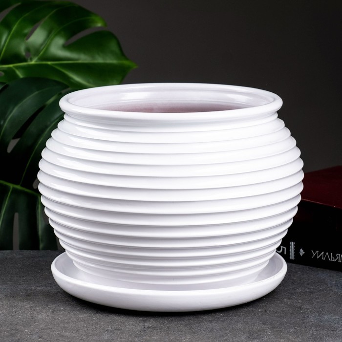 Белый керамический цветочный горшок с поддоном станет изысканным дополнением любого интерьера. Элегантная форма и лаконичный дизайн делают его универсальным выбором для большинства растений.