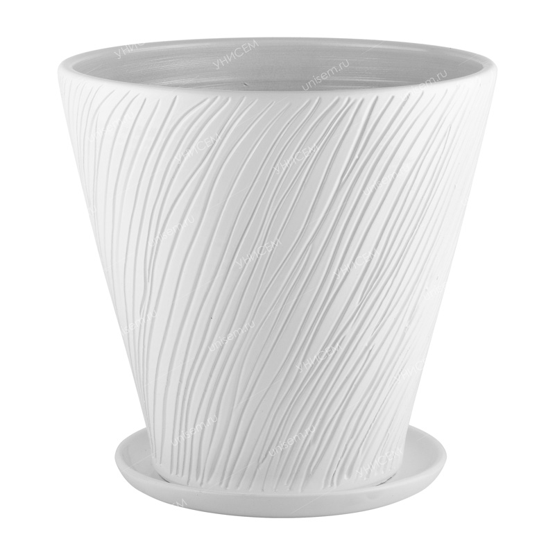 Горшки из обожженной глины – самые распространенные в мире ёмкости для высадки растений. Керамические горшки нравятся почти всем видам декоративной флоры. Они хорошо смотрятся в оранжереях, на улице, в кафе, квартирах, офисах. Горшок «Леон» белоснежного цвета, изготовлен из керамики – материала, который не переохлаждается зимой и не перегревается летом. Пористая структура обожженной глины позволяет горшку дышать и пропускать воздух к корням. Излишки влаги через микропоры испаряются, происходит естественный процесс терморегуляции, что благоприятно сказывается на росте растений. Форма горшка, необычная, конусовидная. На дне ёмкости присутствует дренажное отверстие, через которое излишки воды стекают в поддон предохраняя корни растения от избытка влаги и дальнейшего их загнивания. Объём горшка – 9 литров.