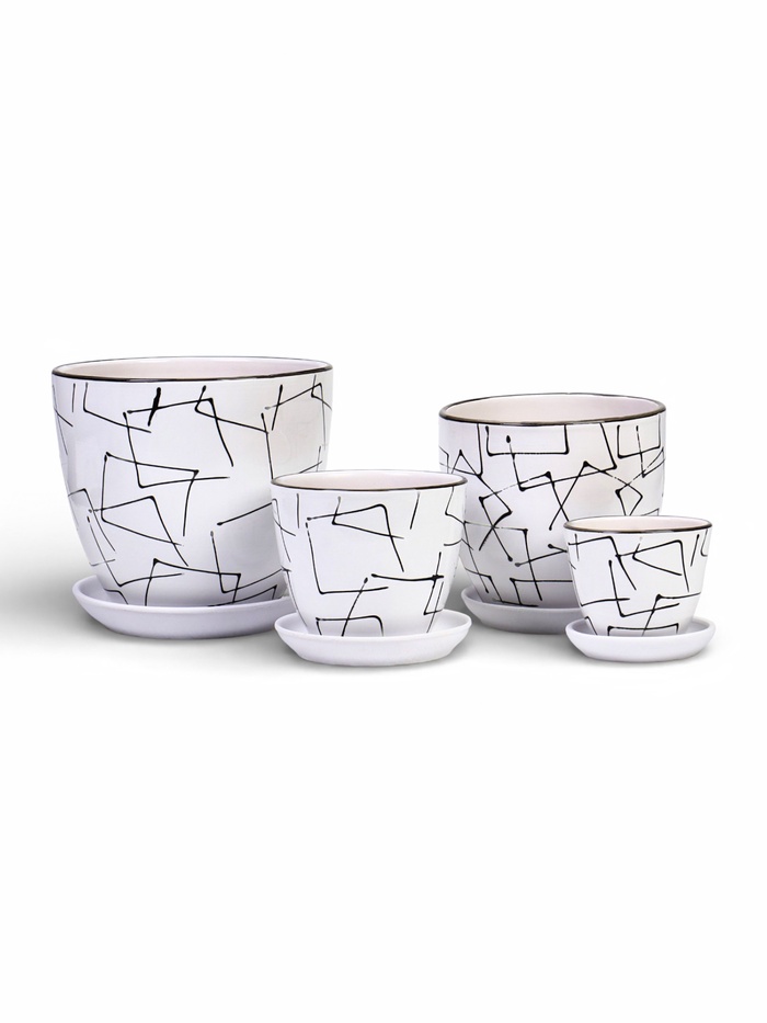 Набор горшков для цветов «Иллюзия», 4 шт., с поддоном, 0.4 / 1 / 2.5 / 5 л, керамика, белые с чёрным орнаментом