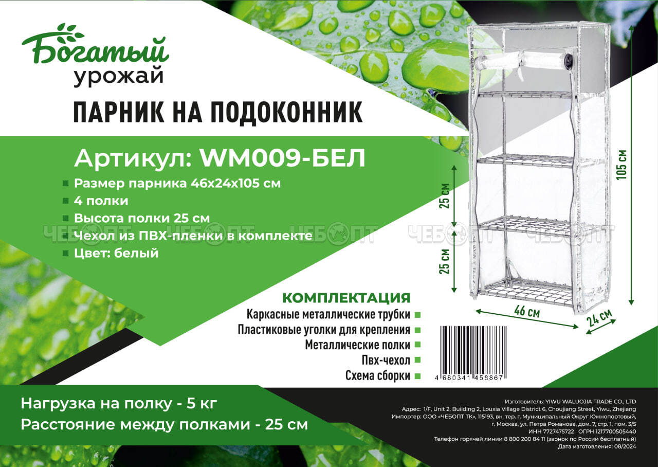 Торгово-производственная компания ЧЕБОПТ продает Парник для рассады (растений) на подоконник 4 полки, 460*240*1050 мм, БЕЛЫЙ металлический каркас + ПВХ пленка мкр арт. WM009-БЕЛ $ [1] Богатый урожай.
