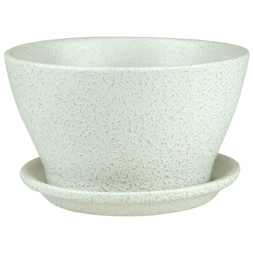 Миниатюрный цветочный горшок выполнен из керамики, в приятном белом цвете. Горшки из керамики – практичный вариант для растений. Внутренняя стенка горшка не обработана, что позволяет пропускать воздух и влагу, регулировать поступление тепла. В жарком и сухом микроклимате корневая система не высохнет, а в прохладном не замерзнет. В горшке предусмотрено дренажное отверстие, через которое излишки воды стекают в поддон предохраняя корни растения от избытка влаги и дальнейшего их загнивания. В комплект входит поддон из керамики покрытый эмалью в цвет основного изделия. Объем – 0,45 литров, диаметр – 12 см.