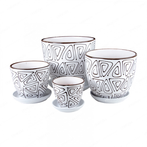 Керамические горшкиявляются интереснейшим решением для декорирования помещений. Набор из 4-х горшков «Авангард элегант» сделан из керамики, подойдёт для разного размера комнатных растений. Окрашен в яркий оттенок, украшен красочным рисунком. Такого стиля набор впишется в любое помещение. Керамика – экологически чистый, природный материал, который имеет хорошую воздухопроницаемость. Стенки горшка сохраняют прохладу в жару и удерживают тепло на холоде.Характеристики:• диаметр горшков – 10,13,16 и 20 см.