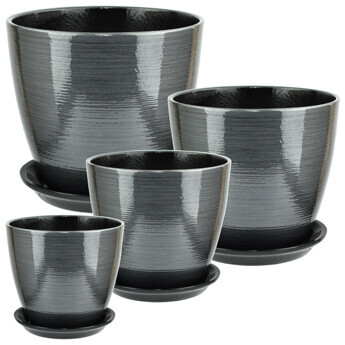 Набор из 4-х цветочных горшков «Бутон Глянец» предназначен для передержки, пересадки или постоянного размещения комнатного растения. Набор изготовлен из окрашенной керамики. Пористый материал создаёт благоприятные условия для большинства комнатных растений, однако в помещении необходимо поддерживать постоянную комнатную температуру. Природный материал пропускает воздух к корням, через поры испаряет излишки влаги. Горшки имеют форму высокий овал, выполнены в глубоком графитовом цвете.  К каждому горшку в комплект входит поддон.Характеристики:• объём горшков – 1, 2, 3,8 и 5,4 л.