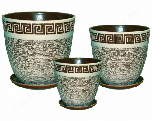 Набор из 3-х горшков «Бутон Меандр» – традиционные керамические горшки необычной расцветки, которая придаст пространству особую изюминку и уют. Удобная флористическая форма и уникальный дизайн сделали этот горшок востребованным и уникальным, тем самым такой горшок подчеркнет вкус хозяйки и станет отличной деталью в интерьере. Керамические горшки подойдут для многих типов растений. Стенки горшка позволяют пропускать воздух и влагу, регулировать поступление тепла. В жарком и сухом микроклимате корневая система не высохнет, а в прохладном не замерзнет. На дне горшка предусмотрено дренажное отверстие, через которое излишки воды стекают в поддон, предохраняя корни растения от избытка влаги и дальнейшего их загнивания.