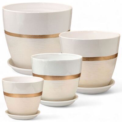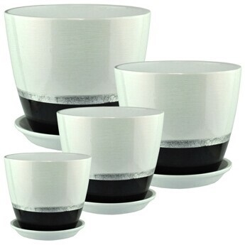 Цветочные горшки – одни из самых красивых декоративных украшений интерьера. Керамика даёт простор для воплощения любого дизайнерского решения, благодаря своим уникальнейшим свойствам. Этот материал всегда был востребованным, более того, керамические горшки очень долговечны и наиболее практичны для роста и развития растений. Набор «Бутон Паталь» в белом цвете с золотой полоской укомплектован поддонами, в каждом горшке есть дренажное отверстие для слива избыточной воды. Из плюсов горшка из керамики – хорошая устойчивость и оптимальный вес, а также возможность испарения лишней влаги и обеспечение притока кислорода корням растения за счет пористой структуры глины. Объем горшков – 1 литр, 2 литра, 3,8 литра, 5,4 литра.