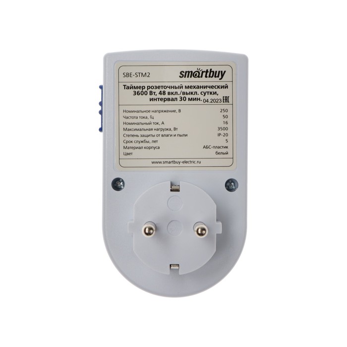 Таймер розеточный Smartbuy, механический, 3500 Вт, 48 вкл./выкл. сутки, интервал 30 мин