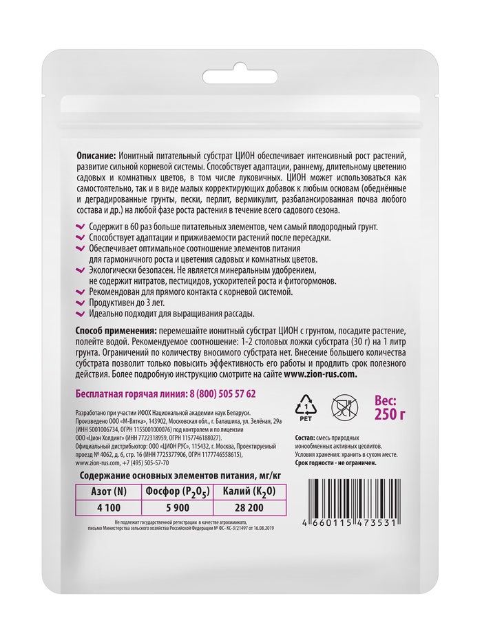 * Действующая основа — цеолит: минеральный компонент повышает рыхлость почвы, регулирует влажность и помогает удерживать полезные элементы питания.