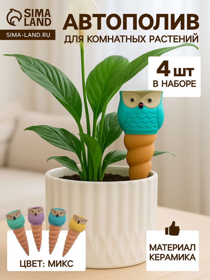 Автополив для комнатных растений «Совушка», 16×6 см, керамика, набор 4 шт., МИКС