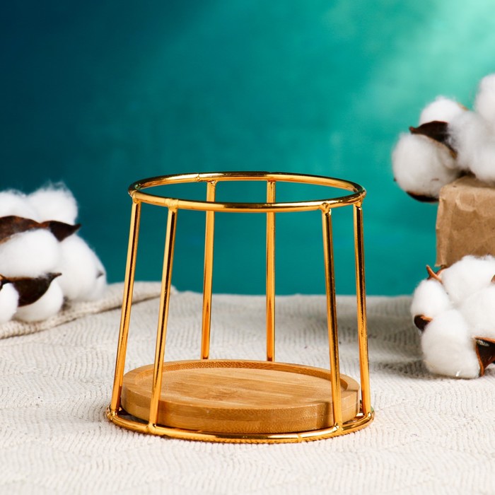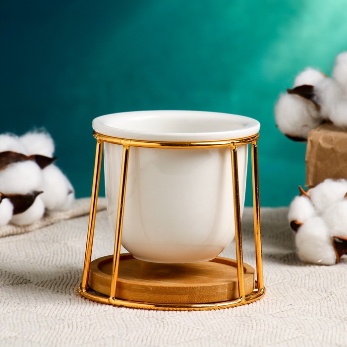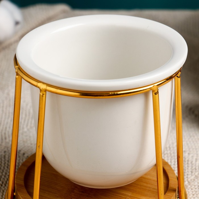 Горшок для цветов «Сосуд» керамический, 250 мл, 11×10 см, белый, с деревянным поддоном, на золотистой металлической подставке