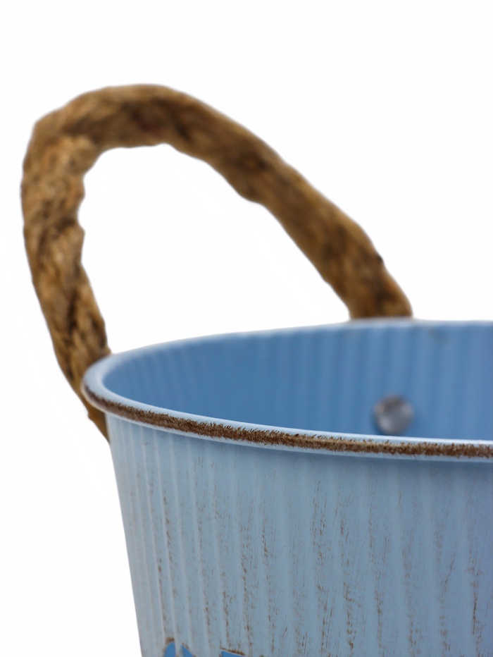 Металлическое кашпо-ведёрко голубого цвета — декоративный контейнер для комнатных растений. Форма классического ведёрка создаёт ощущение уюта и естественности, а голубой оттенок придаёт композиции свежесть.