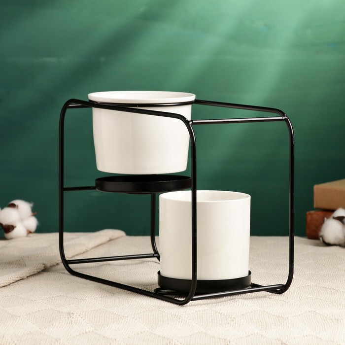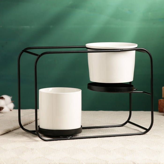 Набор горшков для цветов, 2 шт., 420 / 500 мл, 27×12×19 см, керамика, белые, на чёрной металлической подставке