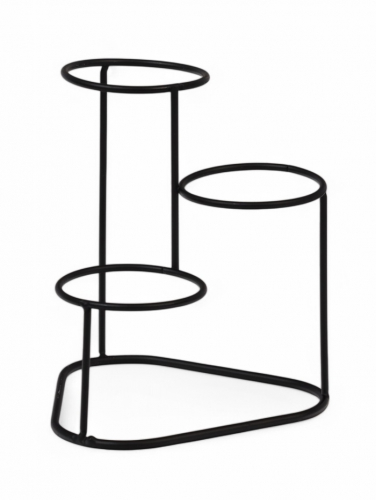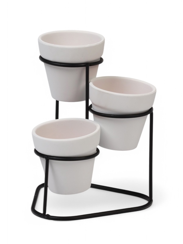 * Дизайн с вертикальной подставкой: три кашпо зафиксированы на подставке на разной высоте. Такой дизайн экономит горизонтальное пространство и придаёт композиции динамичный, современный вид.