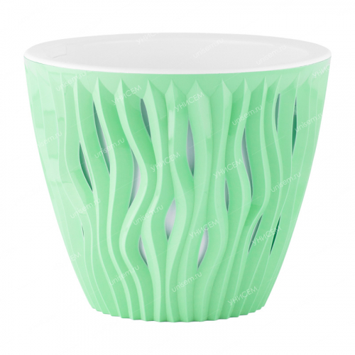 Комнатные растения гармонично вписываются в любую обстановку и наполняют её уютом. Кашпо «Вдохновение» с объёмной волнообразной текстурой поможет подчеркнуть красоту и индивидуальность растения. Кашпо представлены в самых разных объёмах и расцветках, а поэтому подойдут для больших и маленьких растений, простых цветов и сложных флористических композиций. Конструкция предусматривает удобные технологические ручки, которые упрощают уход (пересадка) за растением. Состоит из основного декоративного горшка и внутренней вставки с дренажными отверстиями. Наличие такой дренажной вставки обеспечивает отвод воды от грунта и позволяет дышать корневой системе растения. Кашпо окрашено в мятный цвет, изготовлено из надёжного пластика, благодаря чему отличается прочностью, устойчивостью к ультрафиолету и перепадам температур. Объём – 2,25 литров, диаметр – 17,5 см.