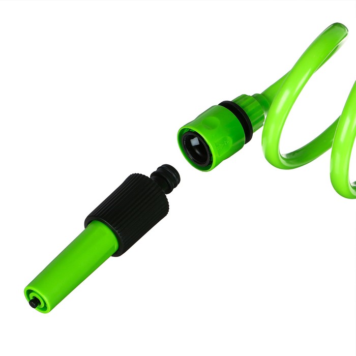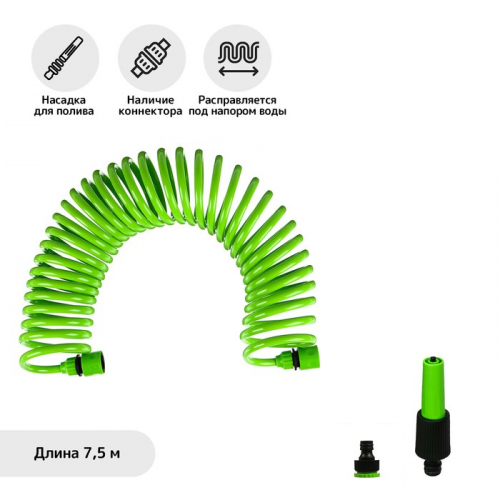 Шланг поливочный спиральный, 7.5 м, быстросъёмный, с насадкой для полива и штуцером, зелёный, Greengo