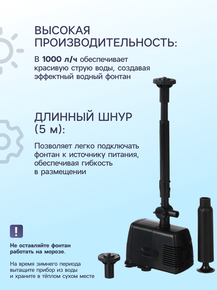 * Простая установка. Фонтан очень легко установить, нужно только погрузить его в водоём и подключить к сети.