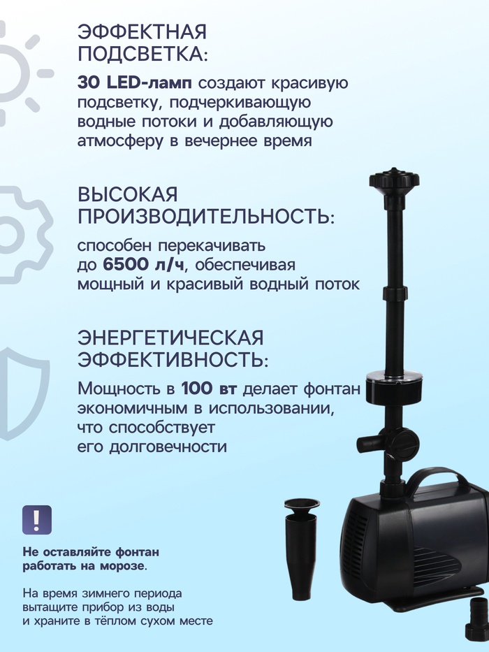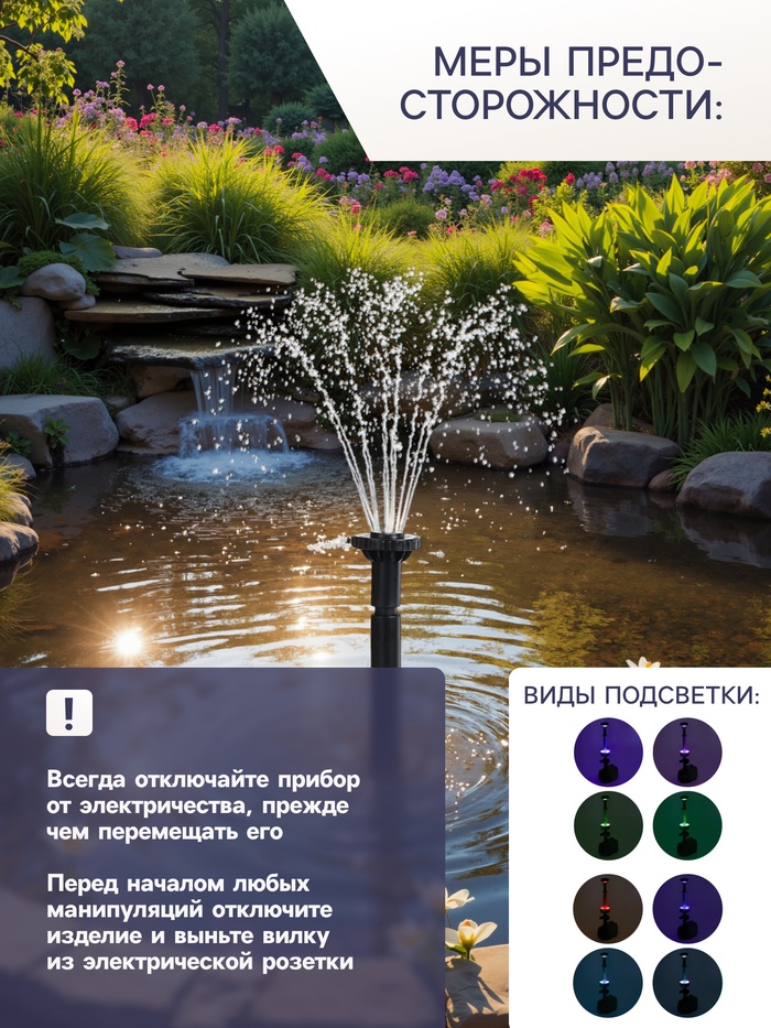 * Простота установки. Фонтан легко установить: нужно погрузить его в водоём и подключить к сети. Готово: можете наслаждаться звуком бегущей воды и красотой световых эффектов.