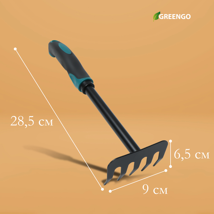 Грабли малые, прямые, 5 зубцов, длина 28.5 см, металл, эргономичная прорезиненная ручка, Greengo