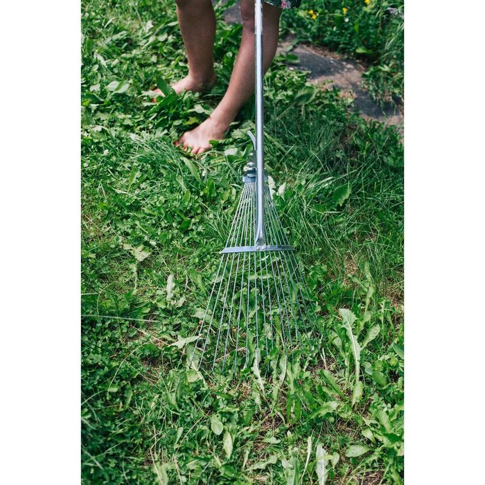 Веерные грабли Greengo — инструмент для бережной уборки в плотных посадках и цветниках. Пятнадцать проволочных зубьев создают густую рабочую поверхность, которая эффективно вычесывает мусор без повреждения растений.