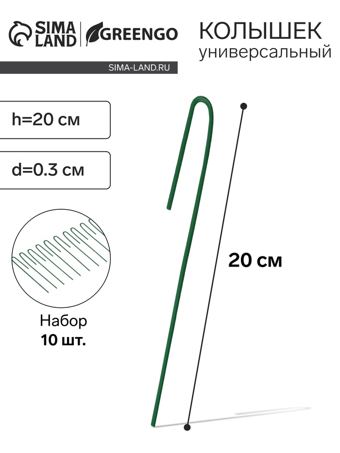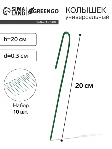 Колышек универсальный, h=20 см, ножка d=0.3 см, набор 10 шт., зелёный, Greengo