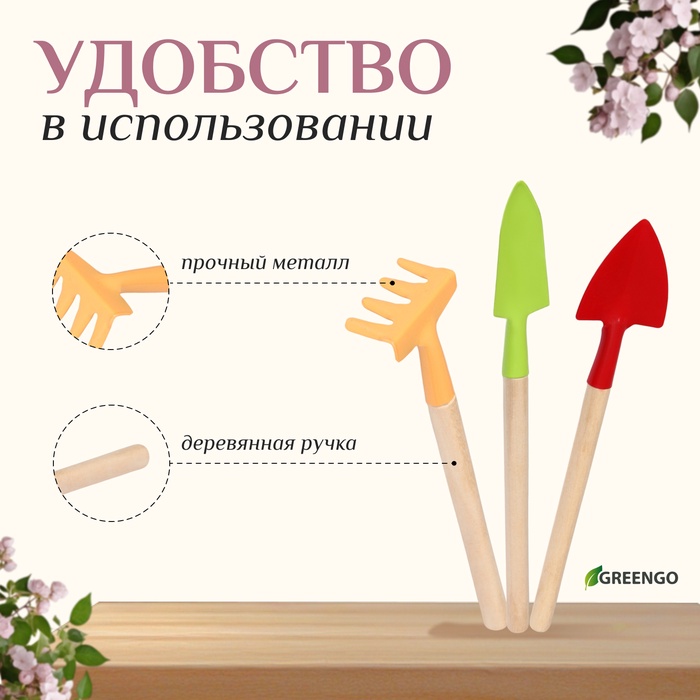 Набор садового инструмента, 3 предмета: рыхлитель, совок, грабли, длина 20 см, Greengo