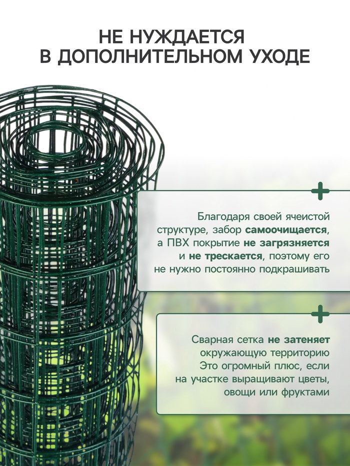 * Надёжная защита: ПВХ-покрытие обволакивает проволоку, создавая барьер от влаги и солнца. Сетка не ржавеет и сохраняет зелёный цвет.