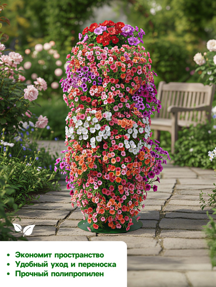 Универсальность применения: Клумбу размещают на балконах, террасах, вдоль заборов или на маленьких дачных участках. Она подходит для петуний, бархатцев, салата или земляники. Вертикальное расположение защищает растения от слизней и упрощает сбор урожая. Конструкция собирается без инструментов и становится мобильным элементом озеленения.