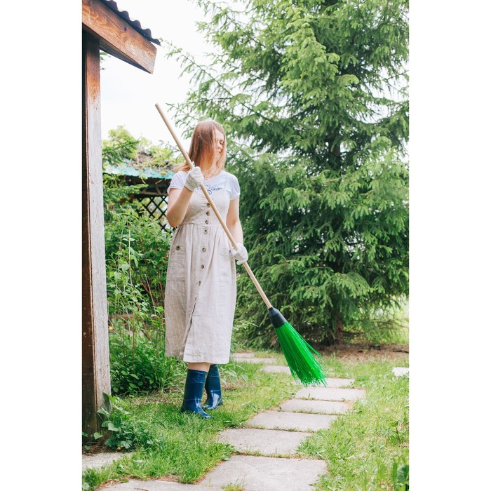 Метла подходит для уборки сухой и мокрой листвы, снега, грязи и другого мусора. Инструмент состоит из пластиковой насадки и берёзового черенка. Если исключить контакт с щелочами и кислотами, то оно прослужит больше двух лет.