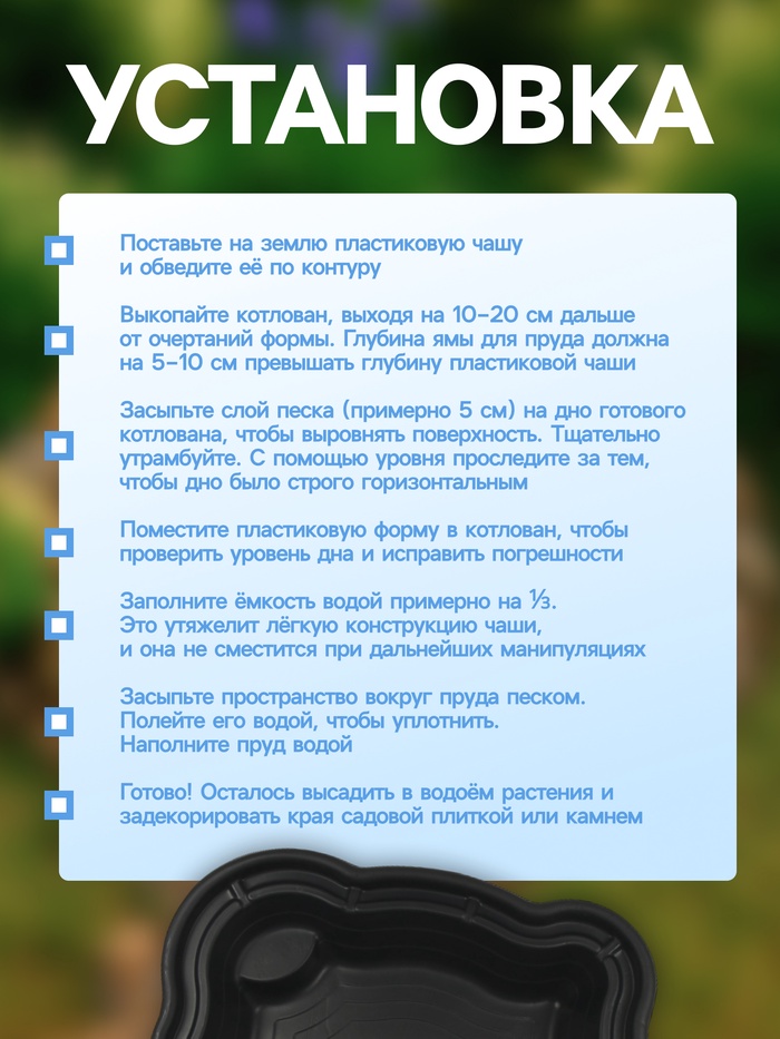 Устройте на даче искусственный водоём. Для этого отлично подойдёт пластиковый пруд. Он подчеркнёт красоту участка, создаст особую атмосферу и расположит вас к расслаблению и созерцанию.